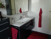 Eine maßgefertigte Waschtischplatte mit Unterschrank und eingelassenem Waschbecken komplettieren dieses Badezimmer.
